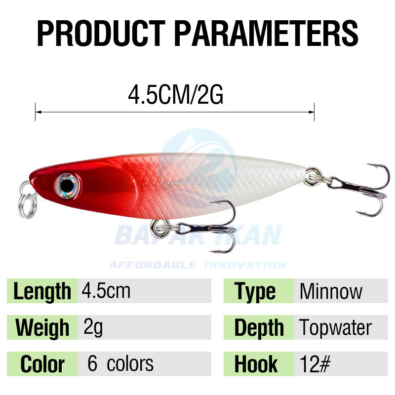 4.5cm/2g Mini Top Water Lure berkualitas tinggi 6 warna umpan umpan buatan untuk memancing bass kecil dengan 2 kait treb