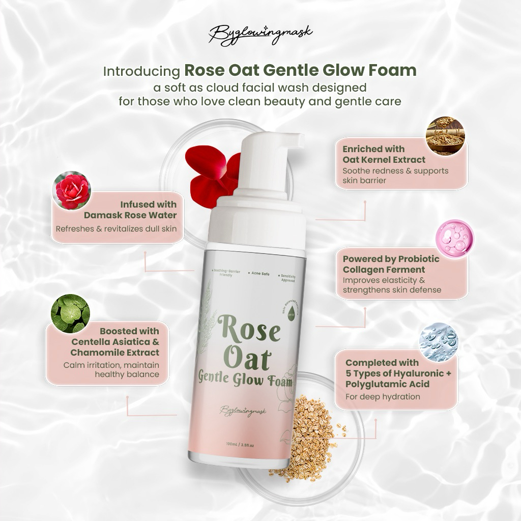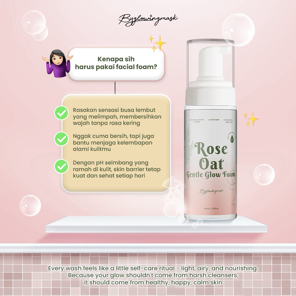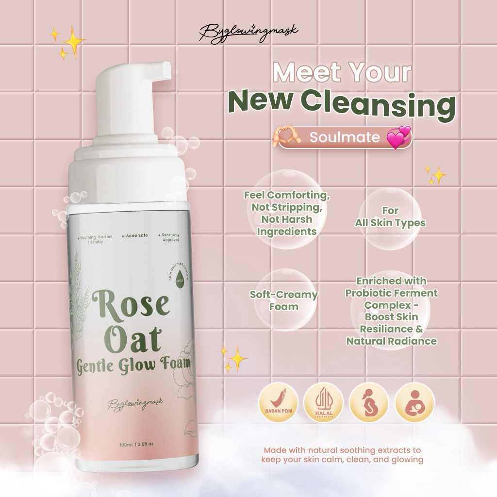 ROSE OAT GENTLE GLOW FACIAL FOAM 100ML - Hydrating Cleanser, Soothing & Brightening - For Sensitive & Glowing Skin - Low Ph, Bumil & Busui Friendly - Byglowingmask