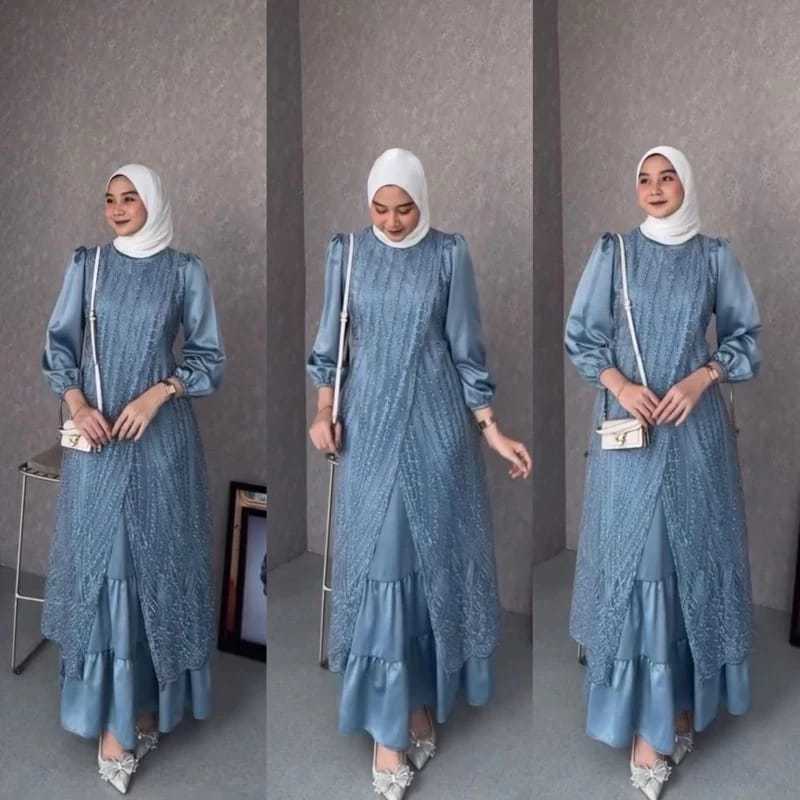 Fuji Dress Pesta Brukat Tille Premium Lebaran Gamis Pesta Mewah Bahan Maxmara Mix Brokat Timbul