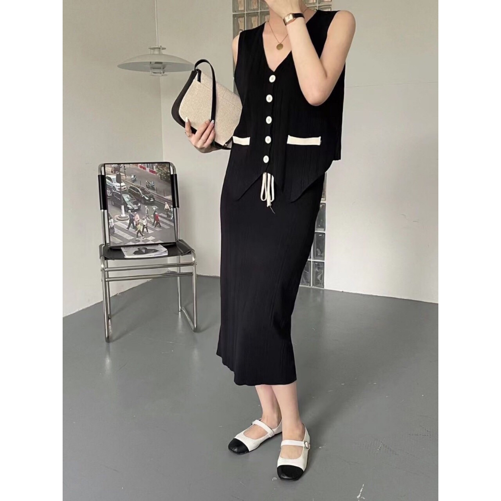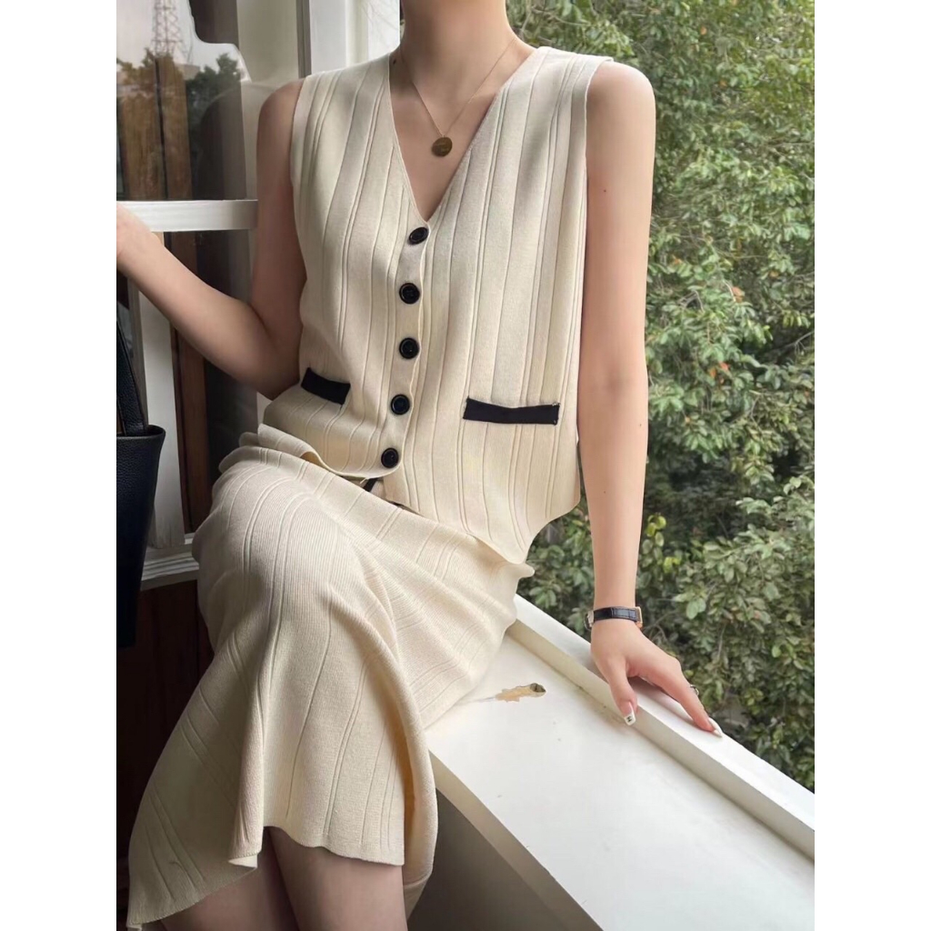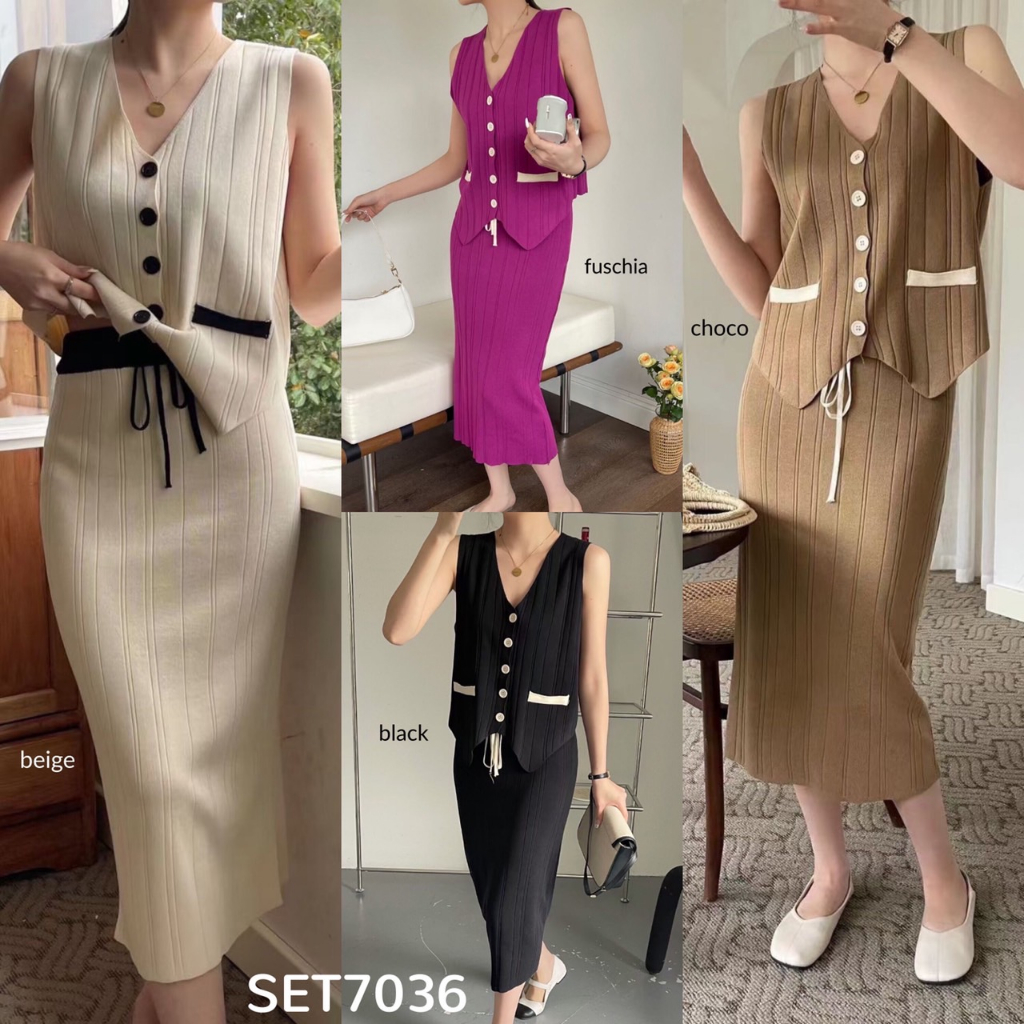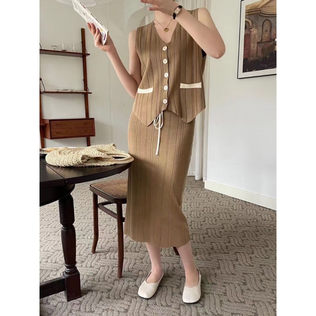 SET7036 Cleo Contrast Knit Set Vest n Midi Skirt
