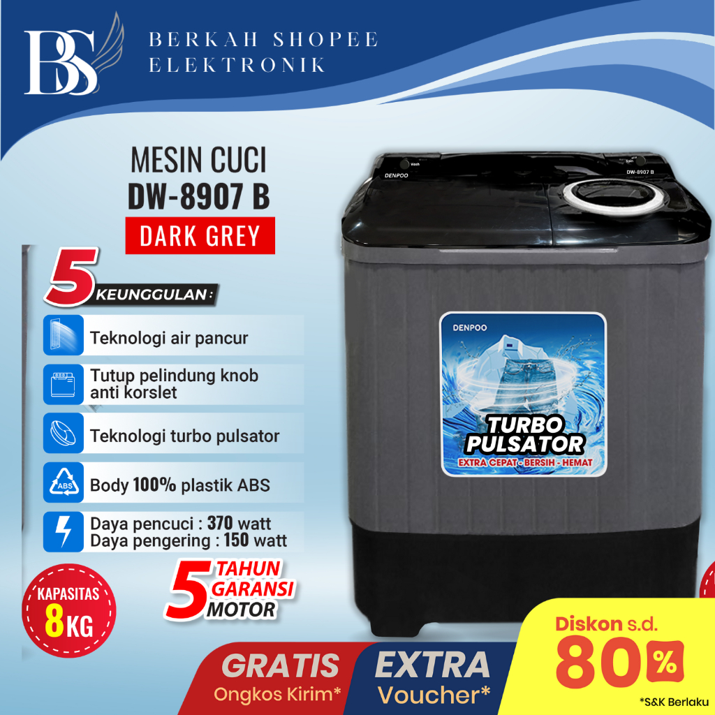 DENPOO MESIN CUCI 2 TABUNG DW 8907 1P & DW 828 KAPASITAS 8 KG TERLARIS DAN SUPER HEMAT LISTRIK