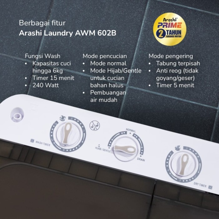 ARASHI Mesin Cuci 2 tabung 6kg AWM 602B - Garansi