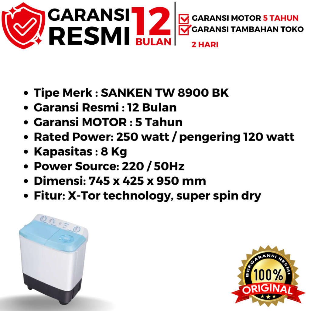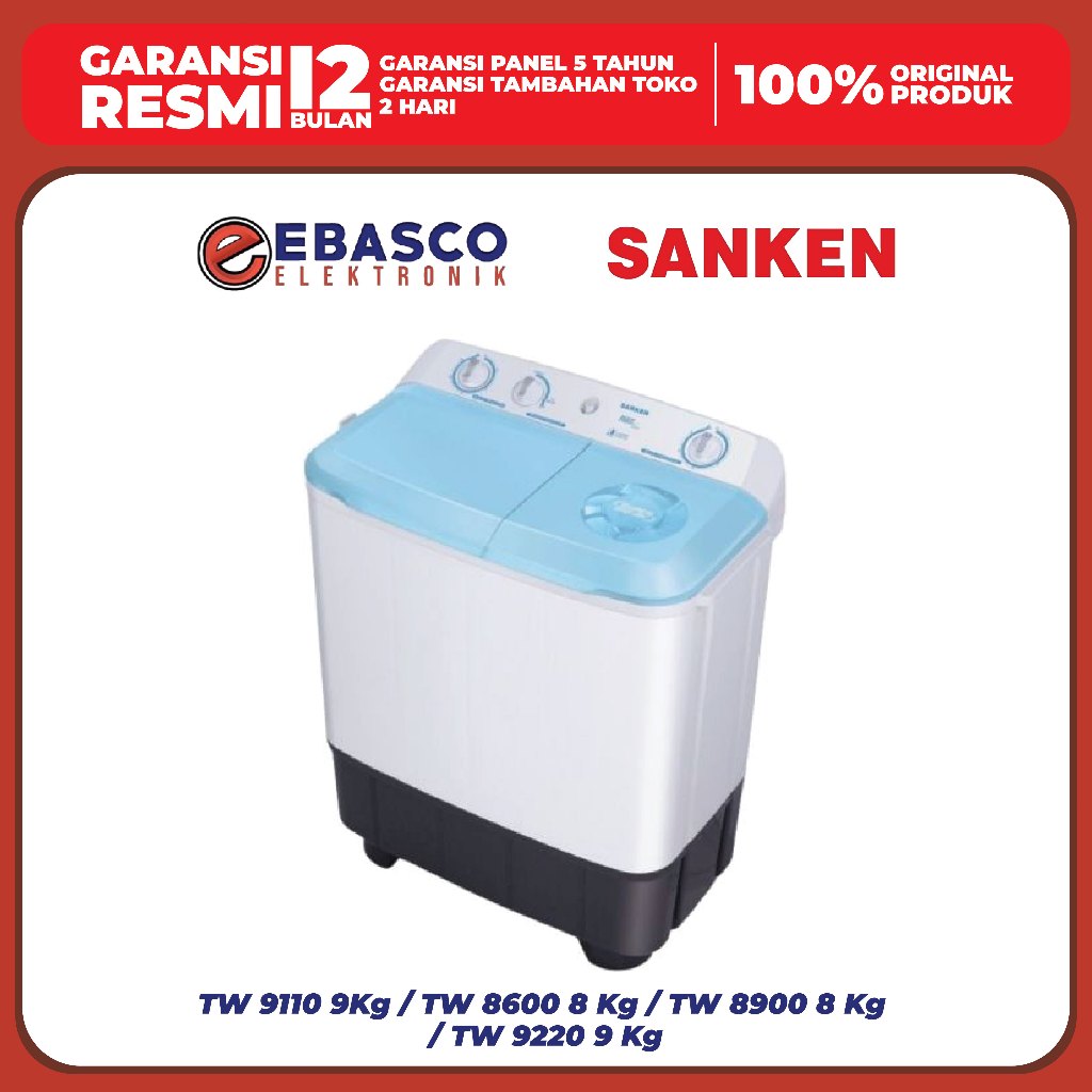 SANKEN Mesin Cuci 2 Tabung TW 9110 9 Kg / TW 8600 8 Kg / TW 8900 8 Kg / TW 9220 9 Kg Low Watt Bergaransi Resmi