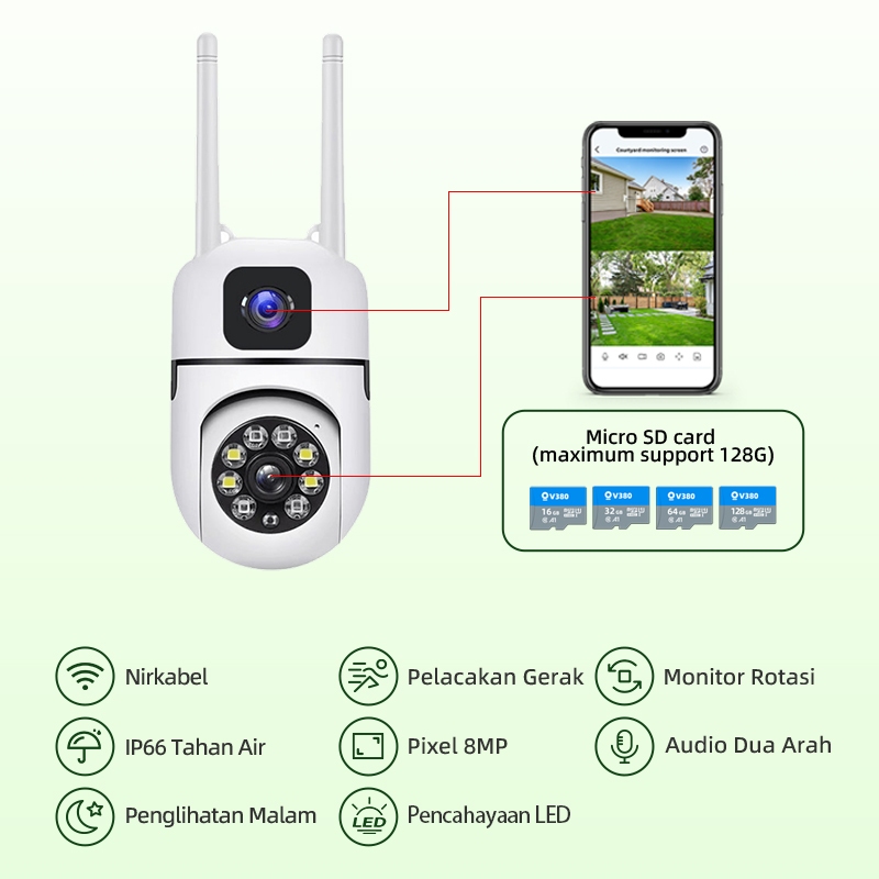 CCTV WiFi Dual Lensa Outdoor 1080P Full HD 1 Kamera Ganti 2 Pantau Lewat HP Night Vision Tahan Hujan