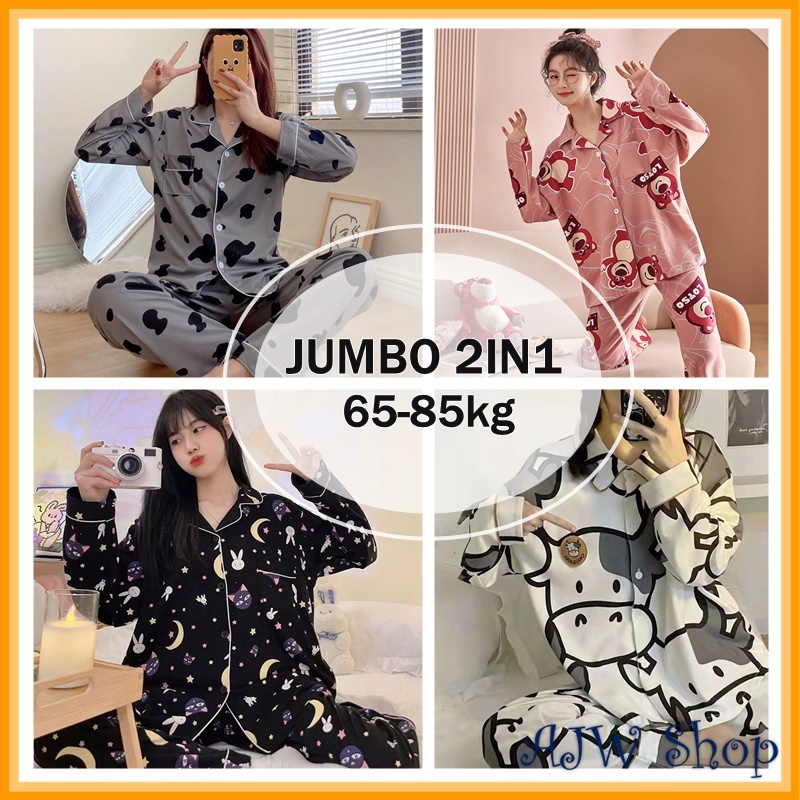 AJW [JUMBO SAMPAI BB 85Kg] Piyama Kancing JUMBO Lengan Panjang Import | Baju Tidur Jumbo Full Kancing | Piyama Set Jumbo