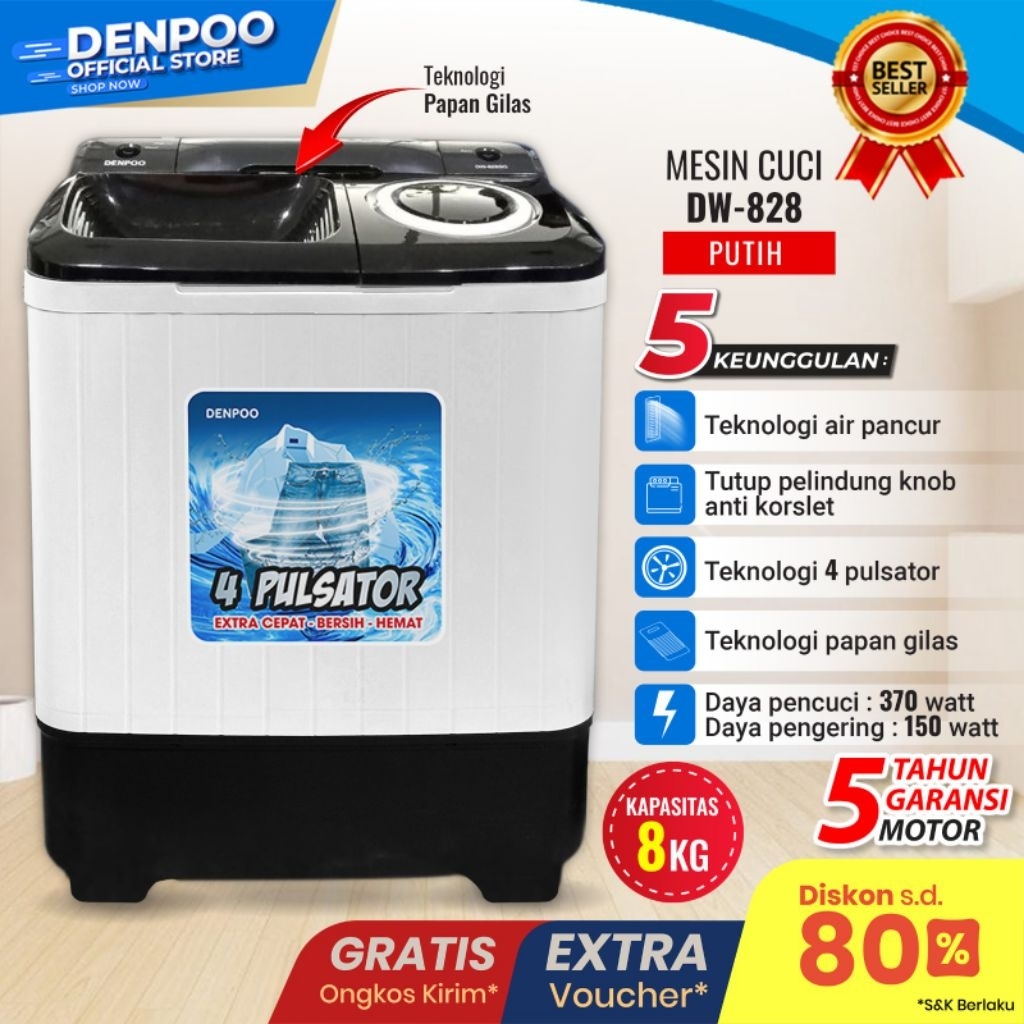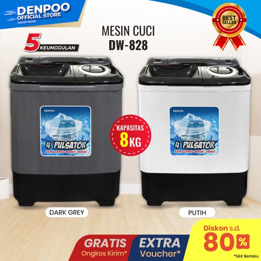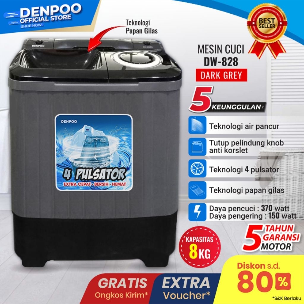 Denpoo Mesin Cuci 2 Tabung PAPAN PENGILAS Hemat Listrik-DW 828 ( 8KG )