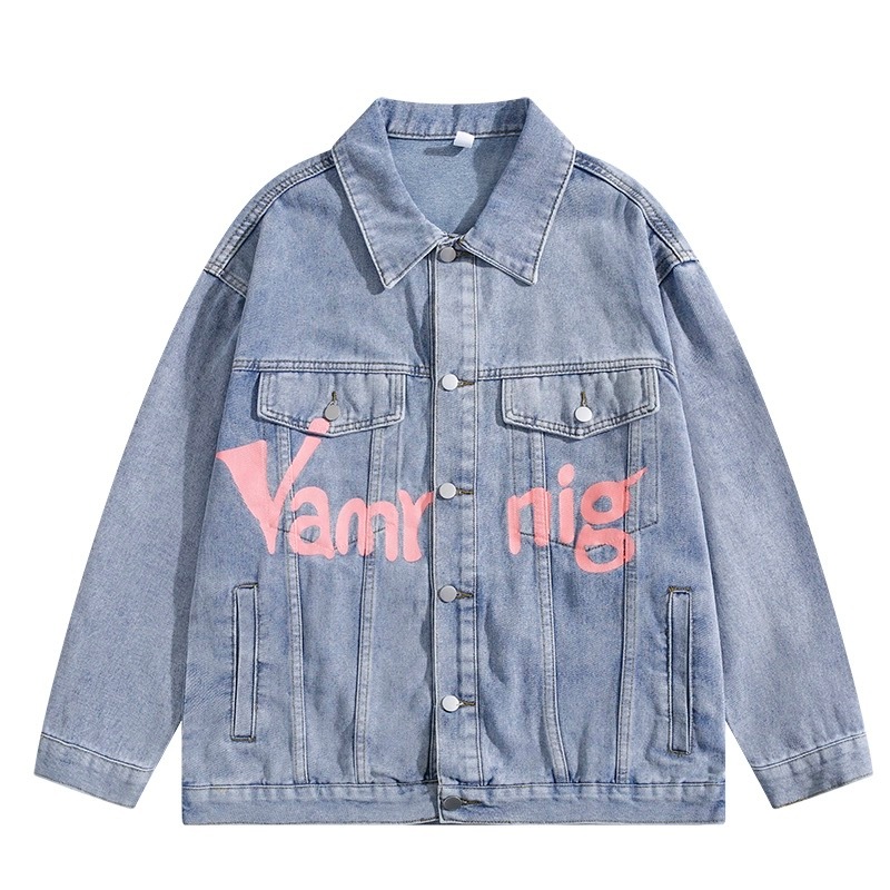 Jaket Denim Motif Huruf Grafiti Jaket Lengan Panjang Longgar