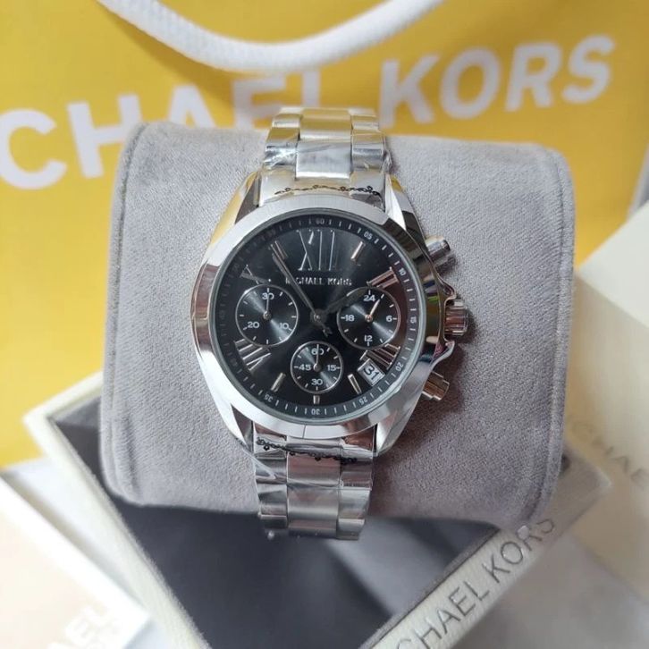 JAM TANGAN WANITA MICHAEL KORS BRADSHAW MK5705 SILVER DIAL BLACK STAINLESS STEEL ORIGINAL - FREE ONGKIR
