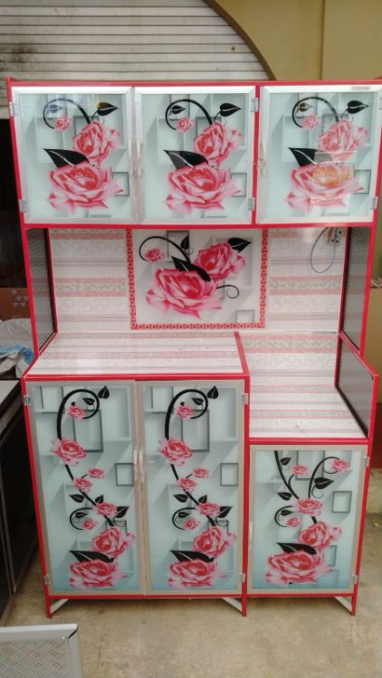 Lemari Piring Rak Piring Kaca Lukis 3 Pintu Bunga Keramik Khusus Bogor
