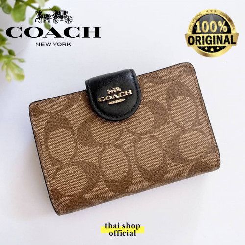 Tas Wanita COACH Medium Corner Zip Wallet Signature Khaki Black