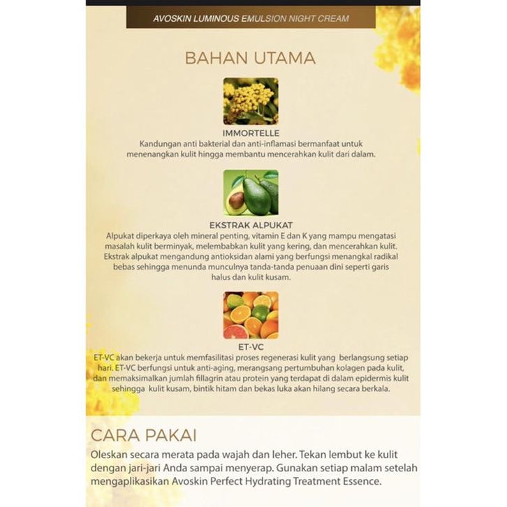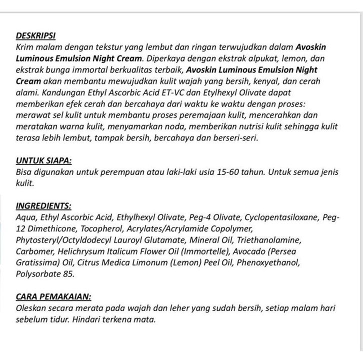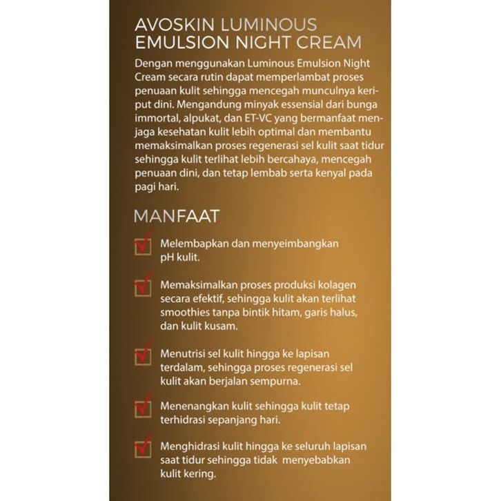 Avoskin Luminous Emulsion Night Cream / KHALISA STORE / SKINCARE MAKEUP ORIGINAL / SET PAKET / OFFICIAL