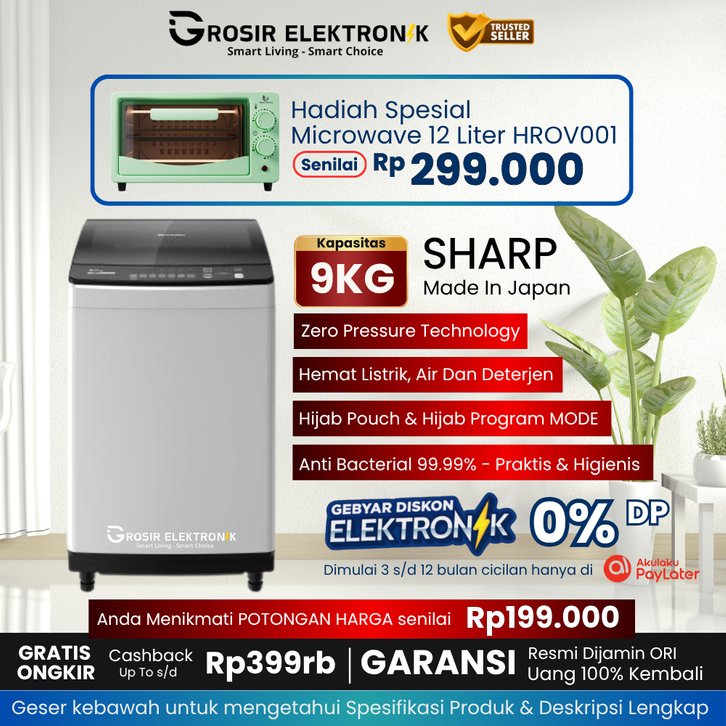 GRATIS ONGKIR - Mesin Cuci 1 Tabung 9 KG Zero Technology - Top Loading SHARP [ ESM-00T ] - mesin cuci sharp 9kg