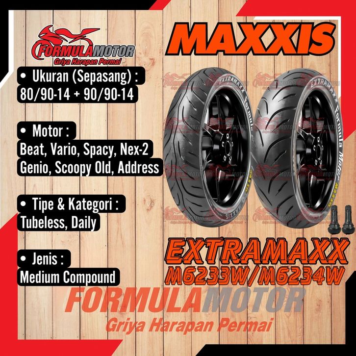 80/90-14 + 90/90-14 Ban Maxxis Extramaxx M6233/M6234 Tubeless - Sepasang Ban Beat, Vario, Spacy, Genio, Nex-2
