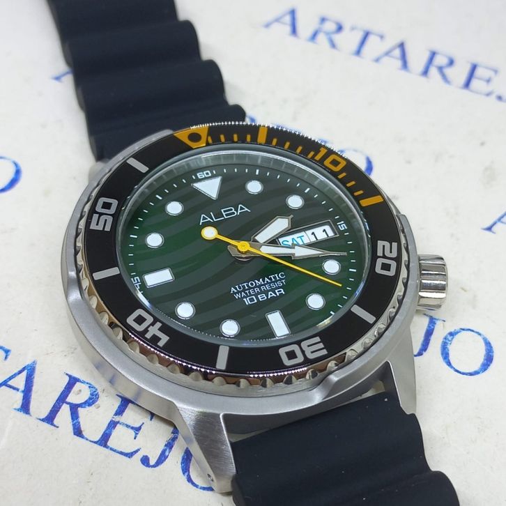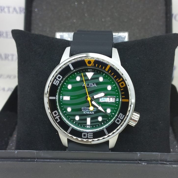 Original JAM TANGAN PRIA ALBA AL439X1 GREEN DIAL BLACK RUBBER AUTOMATIC Garansi Resmi 1 Tahun
