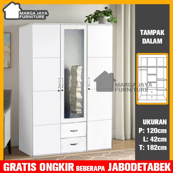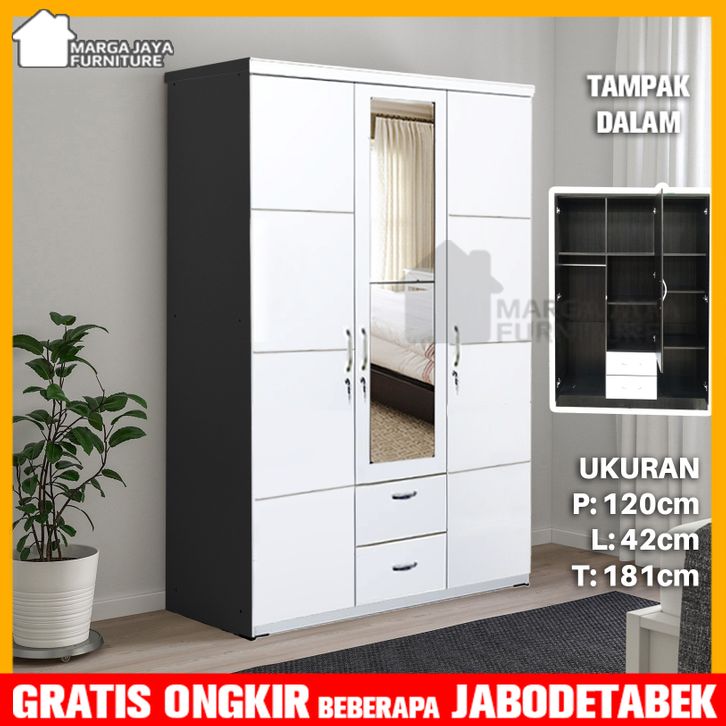 lemari pakaian baju 3 pintu kaca + laci minimalis