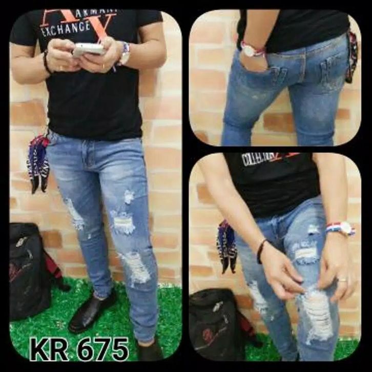 Celana Jeans Pria Pensil Skinny Sobek Ripped Tembus Biru Wash Ukuran 27 - 32
